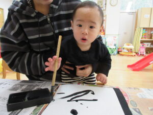 筆を持つもが初めてのお友達も、ママと一緒に書きました👩👶