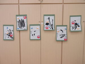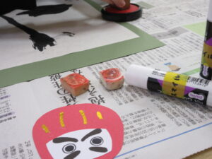 コマと鏡餅とだるまさんはどこに貼ろうかな?