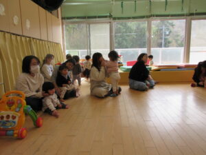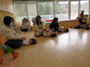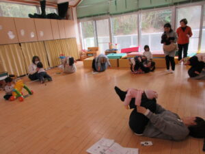 その後は、親子でわらべうたに合わせて体を揺らしたり、指先を刺激したり…![]()