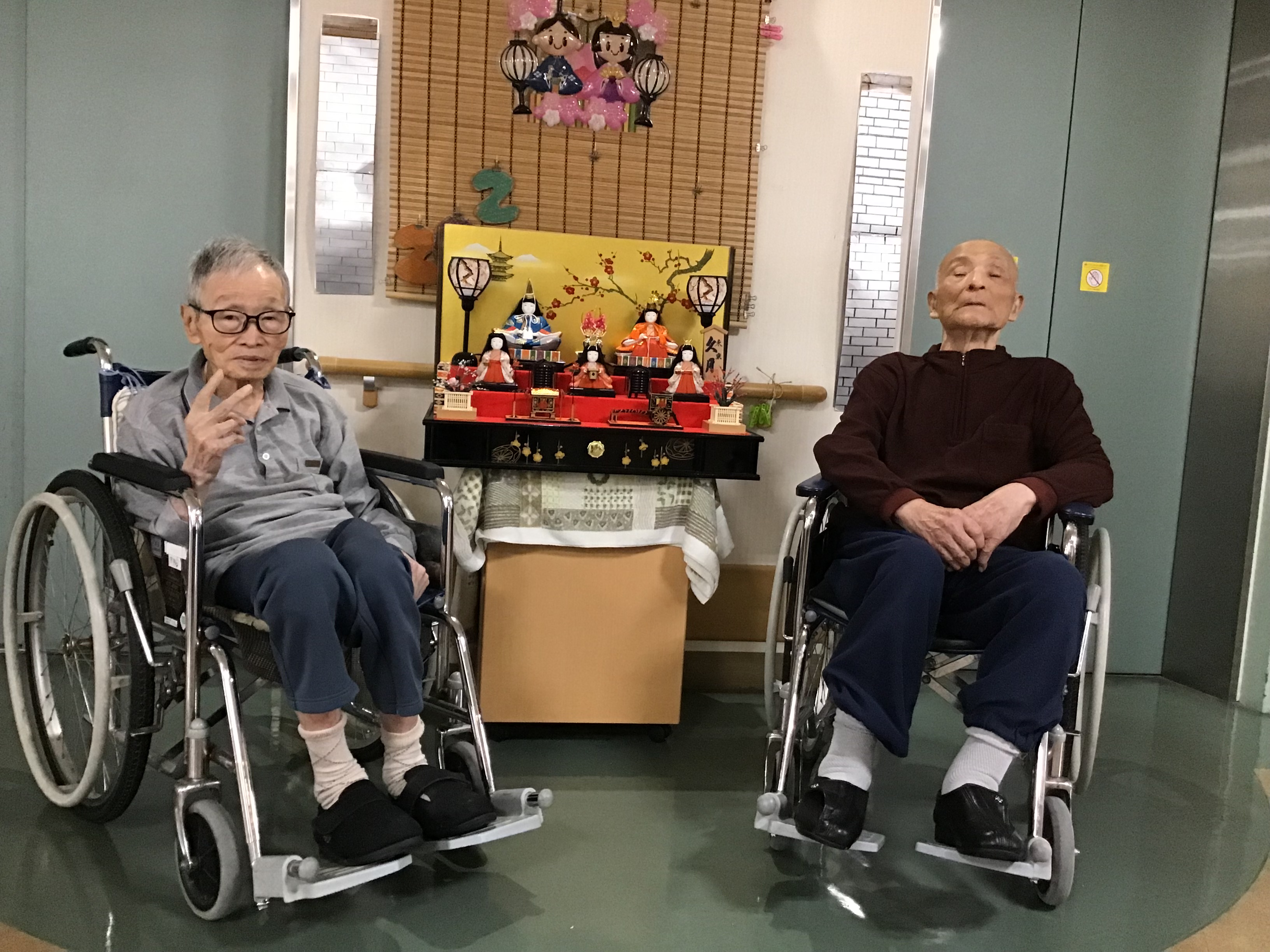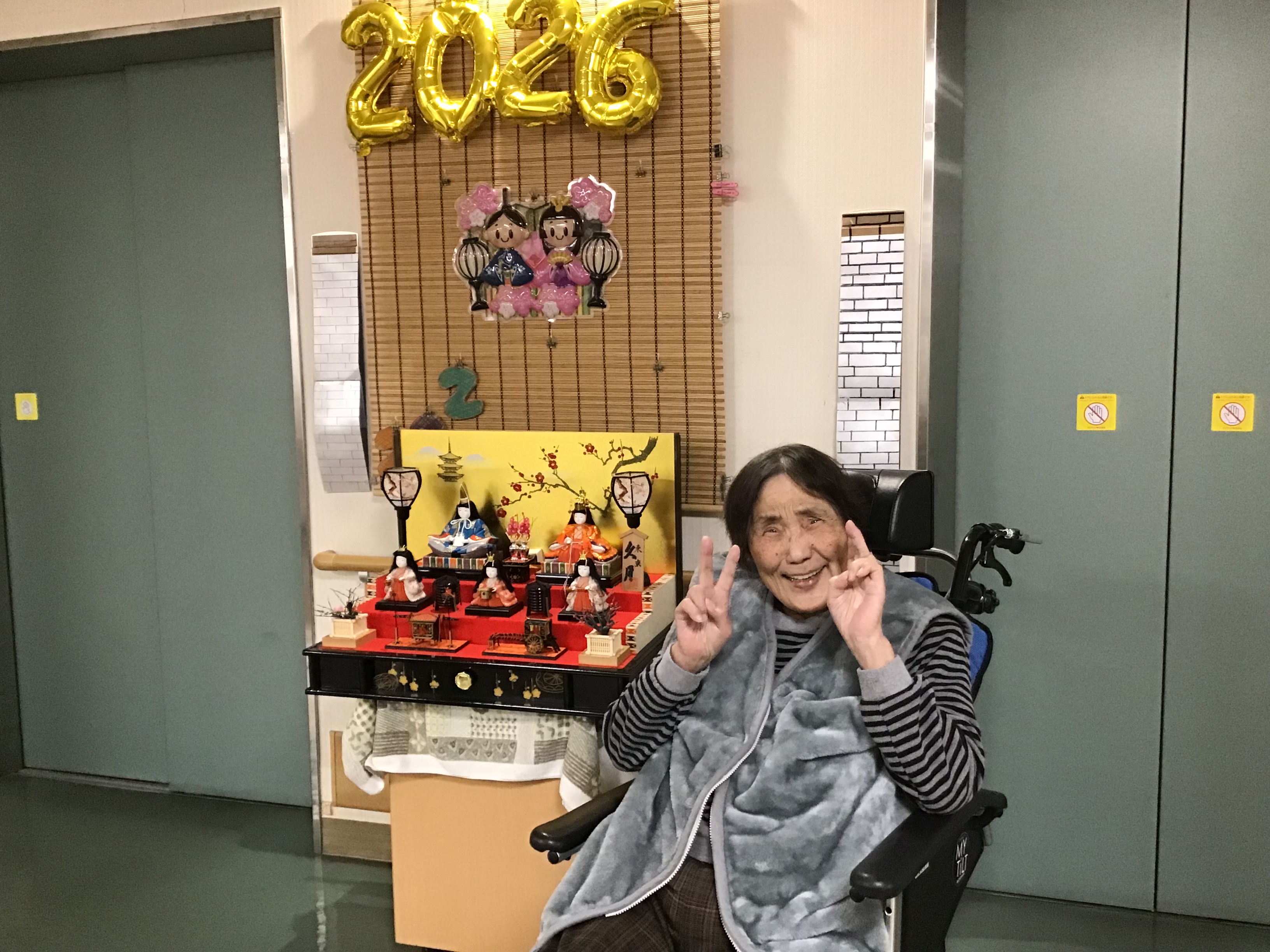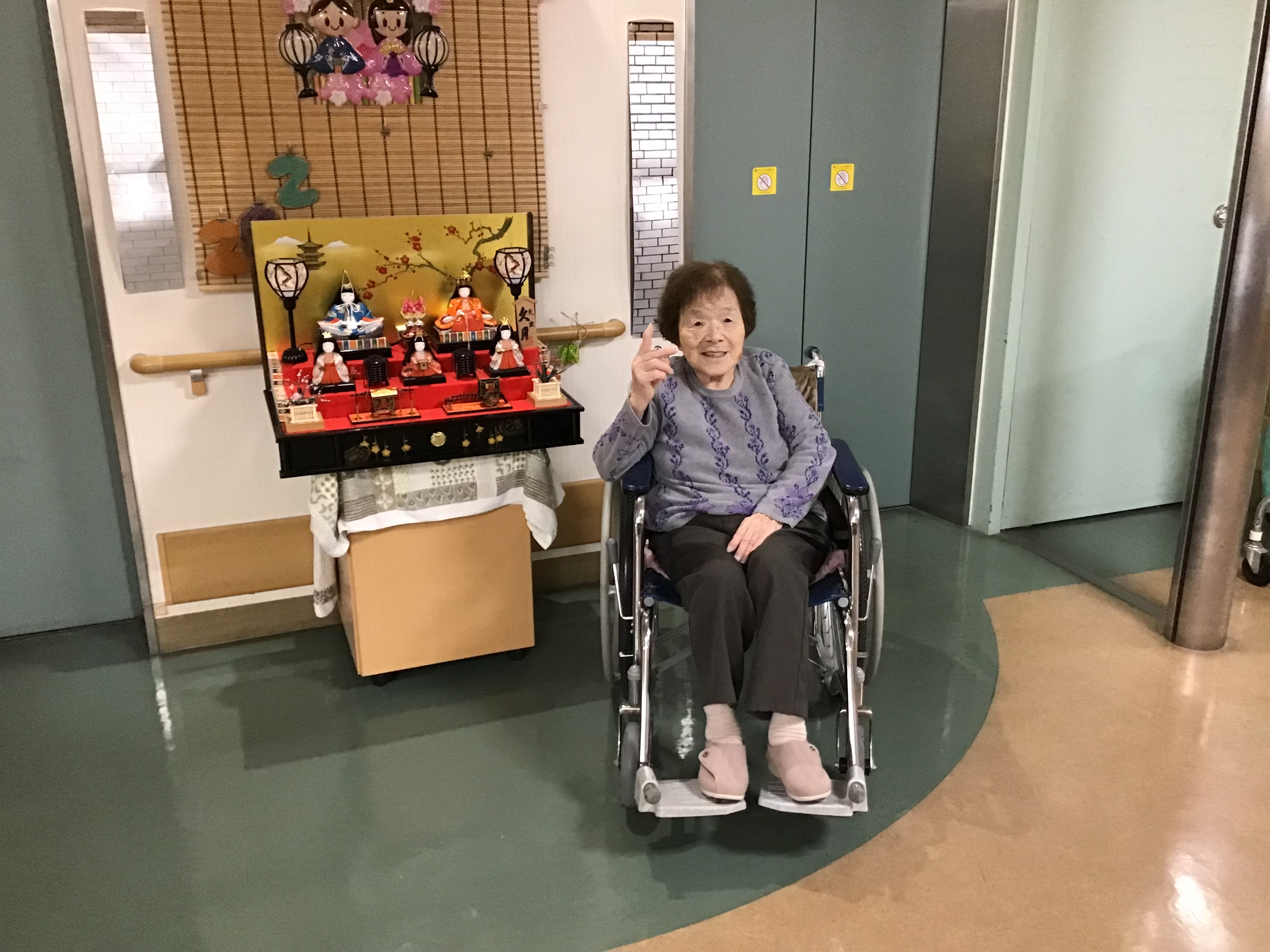 ひな人形を飾り、BGMを流して、皆で歌を歌いました。